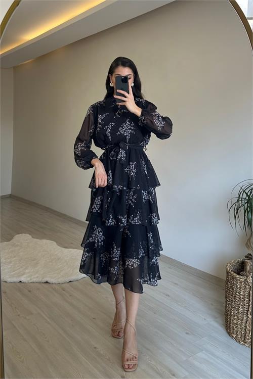Romantik çiçek desenleriyle zarafeti ön plana çıkaran bu kuşaklı şifon elbise, kat kat volanlı eteğiyle feminen bir görünüm sunar. Akışkan kumaş yapısı hafif ve dökümlüdür, gün boyu konfor sağlar. Kuşak detayı vücut hatlarını zarif biçimde vurgularken, zarif yaka kesimi elbiseye modern bir duruş kazandırır. Hem günlük kombinlerde hem de özel davetlerde şık bir tercih olan bu model, dolabınızda zamansız bir parça olacak.