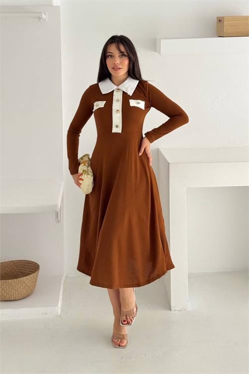 Şıklığı ve rahatlığı bir arada sunan bu midi elbise, modern tasarımıyla özel günlerden günlük kombinlere kadar geniş bir kullanım alanı sunar. Beyaz geniş yaka detayı ve altın düğme süslemeleri ile klasik bir zarafet katan model, uzun kollu yapısıyla serin havalarda da tercih edilebilir. Belden hafif oturan kesimiyle vücut hatlarını zarifçe ortaya çıkarır. Hem topuklu ayakkabılar hem de şık çizmelerle kombinlenebilir.