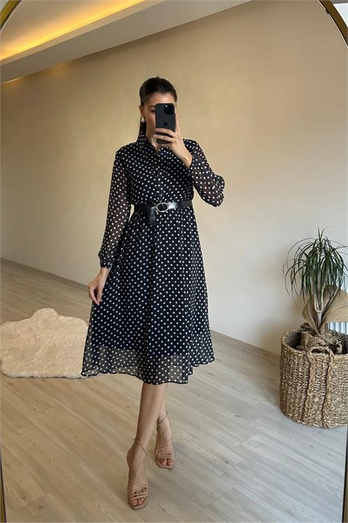 Zarafetin ve feminenliğin buluştuğu bu siyah beyaz puantiyeli şifon elbise, hem günlük hayatta hem de özel davetlerde modern bir görünüm sunar. Hafif dökümlü yapısı, hareket ettikçe zarif bir akış sağlar. Uzun kollu tasarımıyla mevsim geçişlerinde de rahatlıkla kullanılabilir. Bel kısmında yer alan şık tokalı kemer, vücut hatlarını zarifçe ortaya çıkarır. Topuklu ayakkabılarla davetlerde, düz tabanlı ayakkabılarla günlük kombinlerde kolaylıkla tamamlanabilir.