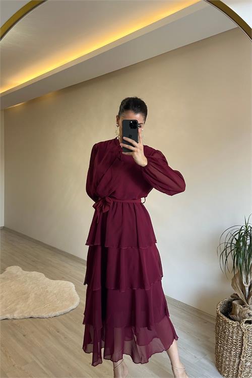 Zarif ve romantik detaylarıyla dikkat çeken bu kat kat volanlı elbise, özel günlerde ve davetlerde modern bir şıklık sunar. Kuşaklı beli sayesinde vücut hatlarını zarifçe vurgular, dökümlü şifon kumaşı ise hafif ve akışkan bir siluet oluşturur. Kat kat etek yapısı yürüyüşe zarif bir hareket kazandırırken, uzun kollu formu mevsim geçişleri için ideal konfor sağlar. Gündüz davetleri, nişan, özel organizasyonlar veya sade şıklık isteyen özel gün kombinleri için mükemmel bir tercihtir.