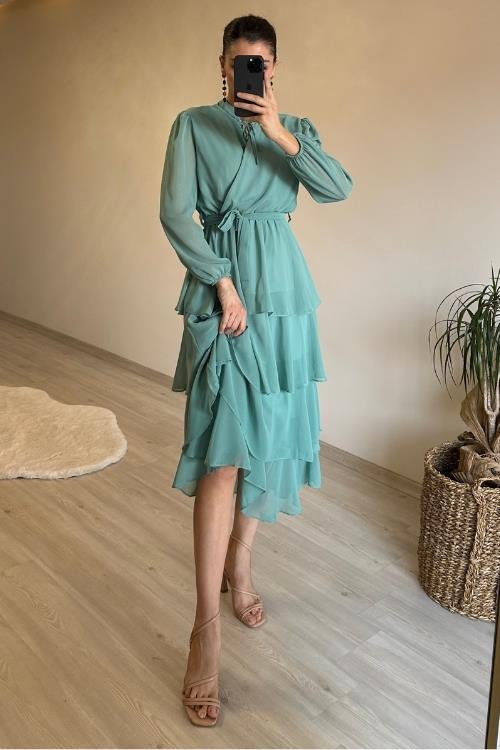 Dipmoda kadın kat kat volanlı kuşaklı midi şifon elbise NM004