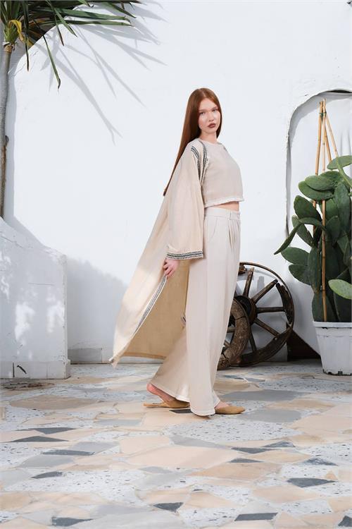 Dipmoda kadın keten nakış detaylı alt üst kimonu takım DPDM50001 (DPDM50001)