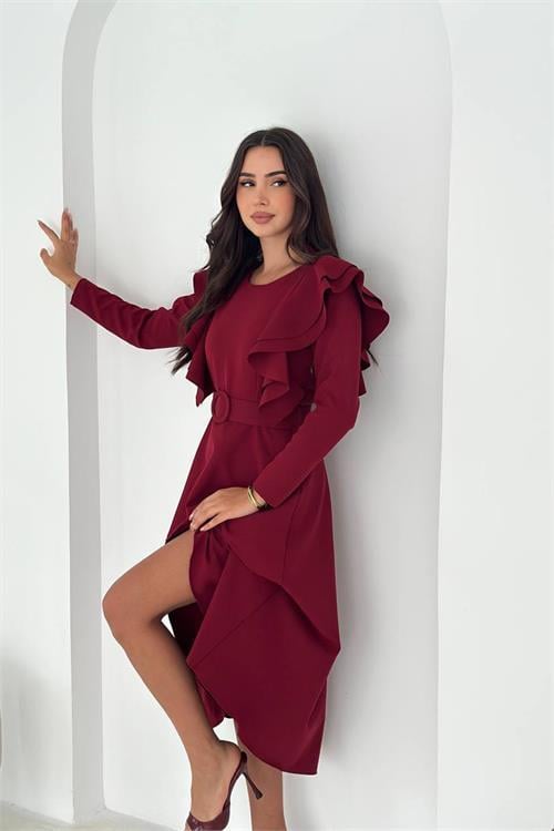 ÜRÜN ADI:Dipmoda kadın kol fırfırlı kemerli midi boy elbise DPK4309