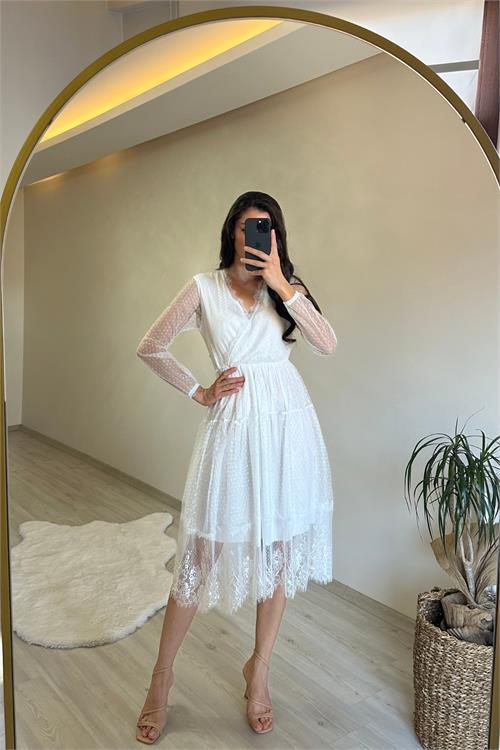 Dipmoda kadın kruvaze yaka dantelli tül elbise NM010