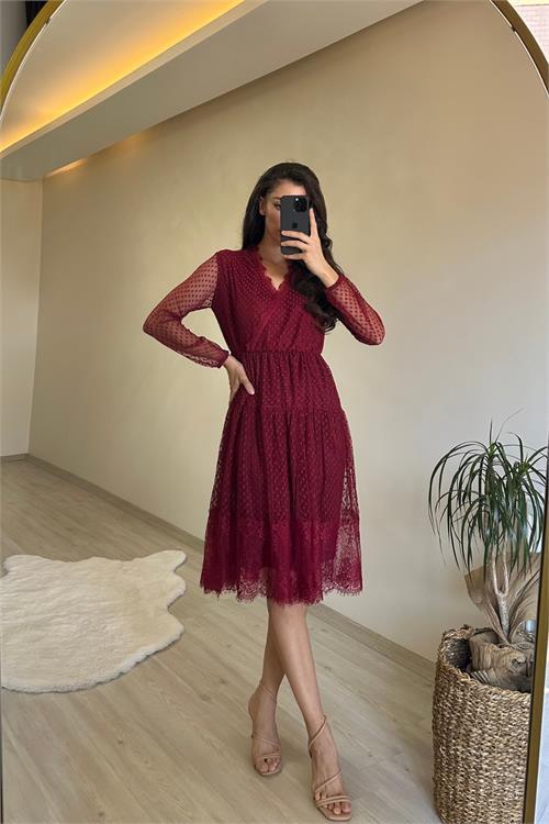 Zarif detaylarıyla dikkat çeken bu kruvaze yaka dantelli elbise, romantik bir şıklık sunar. Tül dokulu kumaşı ve dantel detaylarıyla özel günlerde göz alıcı bir duruş sağlar. Bel kısmındaki hafif büzgü formu vücuda zarif bir şekil kazandırırken, midi boy kesimi modern bir görünüm oluşturur. Düğün, nişan, mezuniyet, davet ve özel organizasyonlarda sade ama etkileyici bir şıklık elde etmek isteyenler için mükemmel bir tercihtir.
