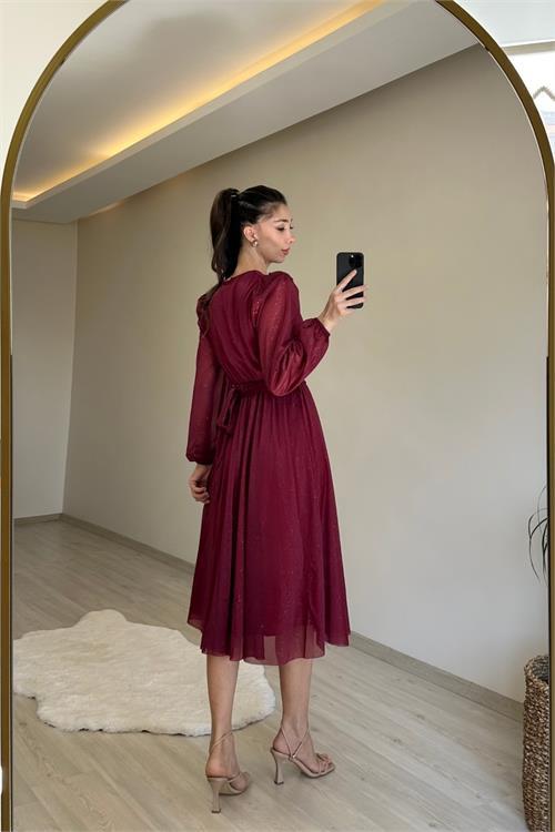 Zarif ve ışıltılı görünümüyle dikkat çeken bu kruvaze yaka elbise, özel günlerde şıklığından ödün vermek istemeyen kadınlar için tasarlandı. Işıltılı şifon kumaşı, feminen bir ışıltı sunarken tokalı kemer detayı bele zarif bir vurgu kazandırır. Uzun kollu yapısı ve dökümlü eteğiyle hem konforlu hem de etkileyici bir görünüm sağlar. Düğün, nişan, mezuniyet, davet ve özel organizasyonlarda modern bir zarafet yaratmak için ideal bir seçimdir.
