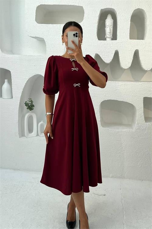 ÜRÜN ADI:Dipmoda kadın kurdele detaylı midi boy balon kol elbise DPMY3578