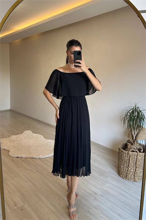 ÜRÜN ADI:Dipmoda kadın omzu açık piliseli midi şifon elbise NM006