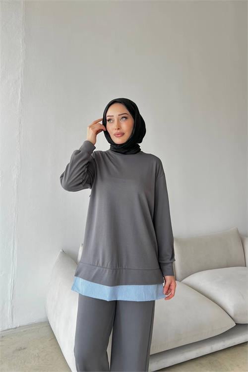 Modern ve rahat çizgileri bir araya getiren bu ikili takım, gün boyu konfor sağlarken şıklığınızdan ödün vermez. Oversize kesimli tunik, katmanlı görünümüyle kombine farklı bir hava katarken, geniş paça pantolon dökümlü yapısıyla zarif bir siluet oluşturur. Günlük yaşamda, ofiste veya özel buluşmalarda kolayca tercih edilebilecek zamansız bir kombin parçasıdır.