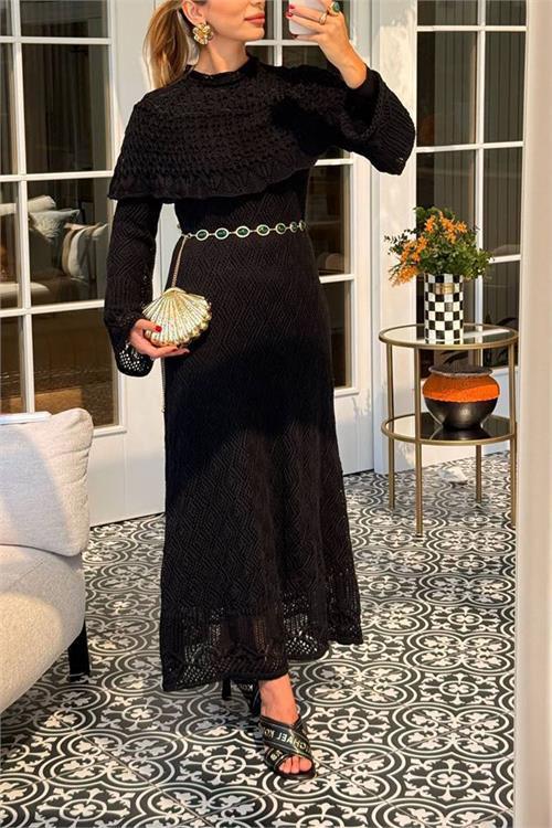 Zarif tasarımıyla öne çıkan uzun kollu triko örgü elbise, modern şıklığı ve konforu bir araya getirir. Maxi boy kesimi ve şık dokusu ile hem günlük kullanımda hem de özel davetlerde tercih edilebilir. Bel kısmında kemerle kombinlendiğinde stilinize farklı bir hava katar.