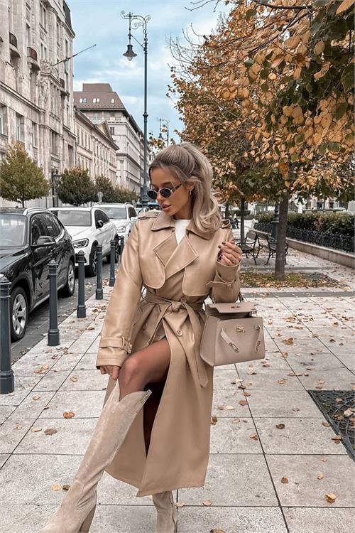 ÜRÜN ADI:Dipmoda kadın suni deri düğmeli cep detaylı tam boy trençkot DPEMP2617