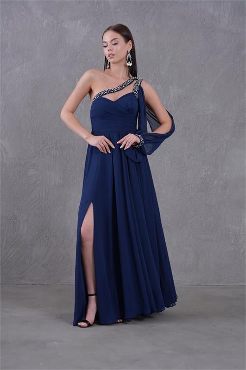ÜRÜN ADI:Dipmoda kadın taş işlemeli tek omuz yırtmaçlı şifon abiye elbise NBS9368