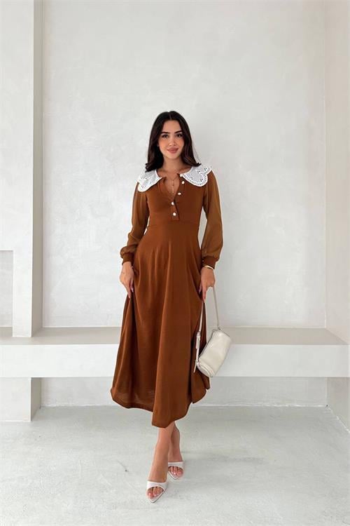 Romantik ve zarif tasarımıyla dikkat çeken bu uzun elbise, beyaz dantel görünümlü geniş yaka ve ön düğme detaylarıyla modern-retro bir stil sunar. Uzun kollu ve rahat kesimi sayesinde hem günlük hayatta hem de özel günlerde tercih edilebilecek şık bir parçadır.