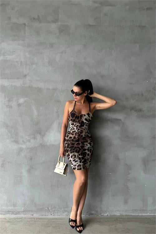 Ürün 36-40 bedene kadar uyumludur, askılı, mini boy, arka çapraz bağlama detaylı, leopar desenli.