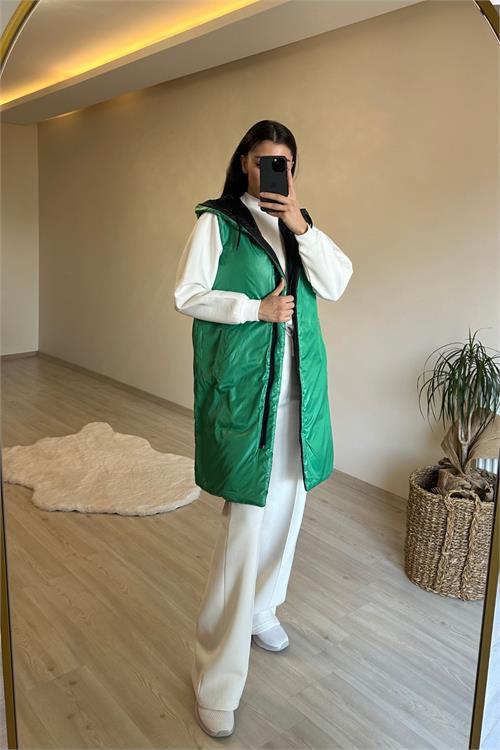 Soğuk havalarda stilinden ödün vermek istemeyen kadınlar için tasarlanan bu uzun model şişme yelek, çift taraflı yapısıyla iki farklı görünüm sunar. Yumuşak dokulu iç astarı, yüksek yaka ve kapüşon detayı ile sıcak tutarken, oversize kesimiyle rahat bir kullanım sağlar. Spor kombinlerden günlük şehir tarzına kadar her alanda kolayca uyum sağlayan bu parça, hem modern hem fonksiyonel bir dolap yatırımıdır.